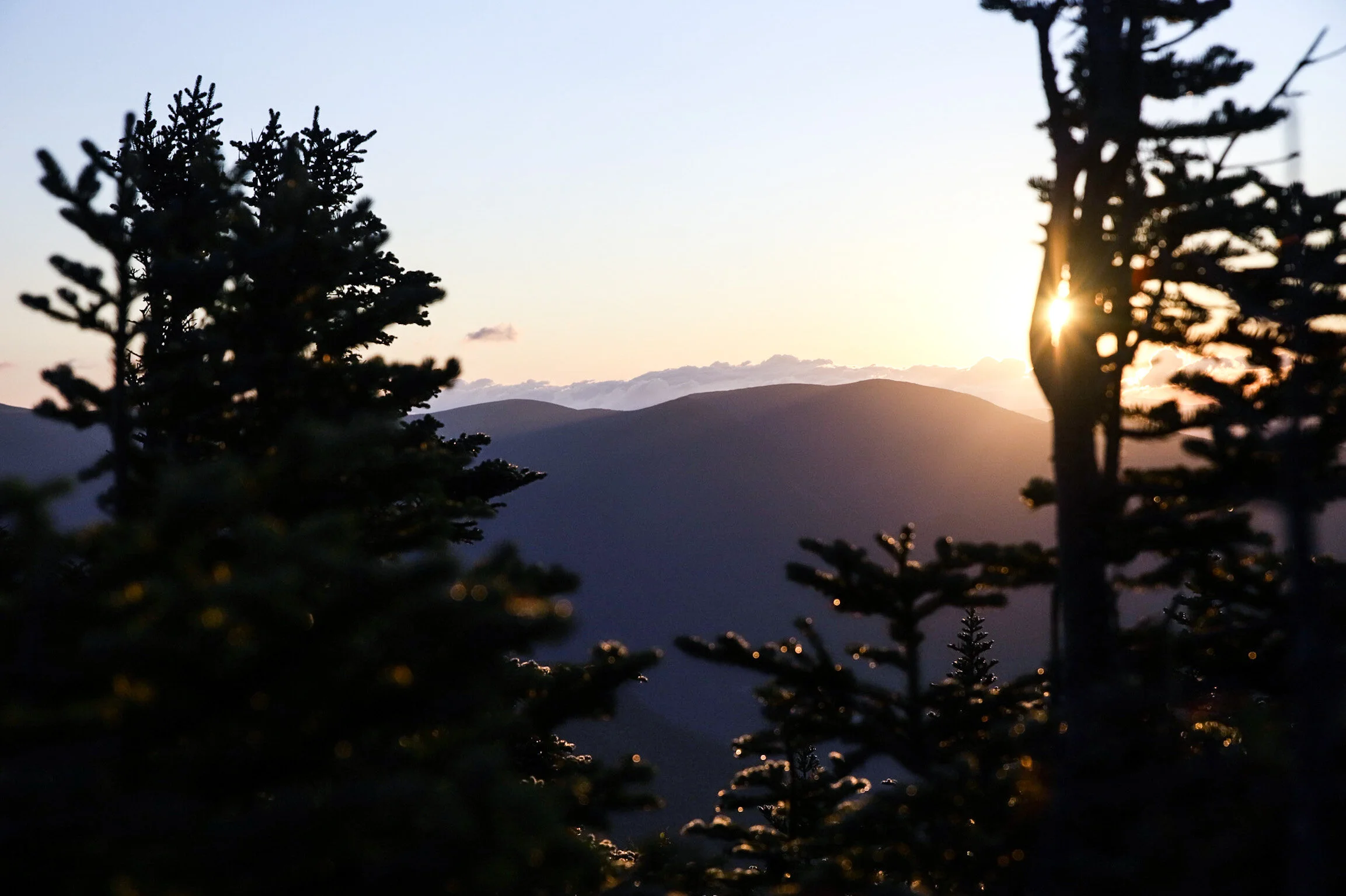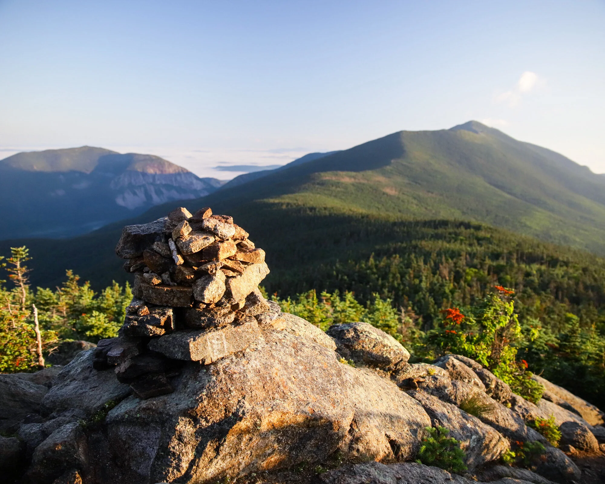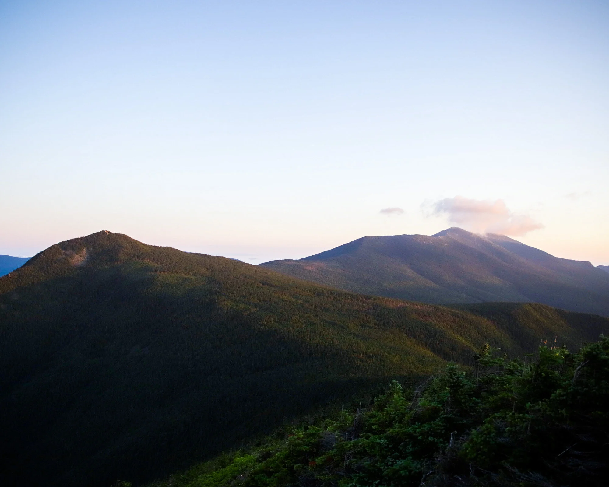 Looking East across the Pemigewasset Wilderness towards Mt. Bond, one of the last peaks of the day’s journey, from the summit of Mt. Flume at sunrise.
