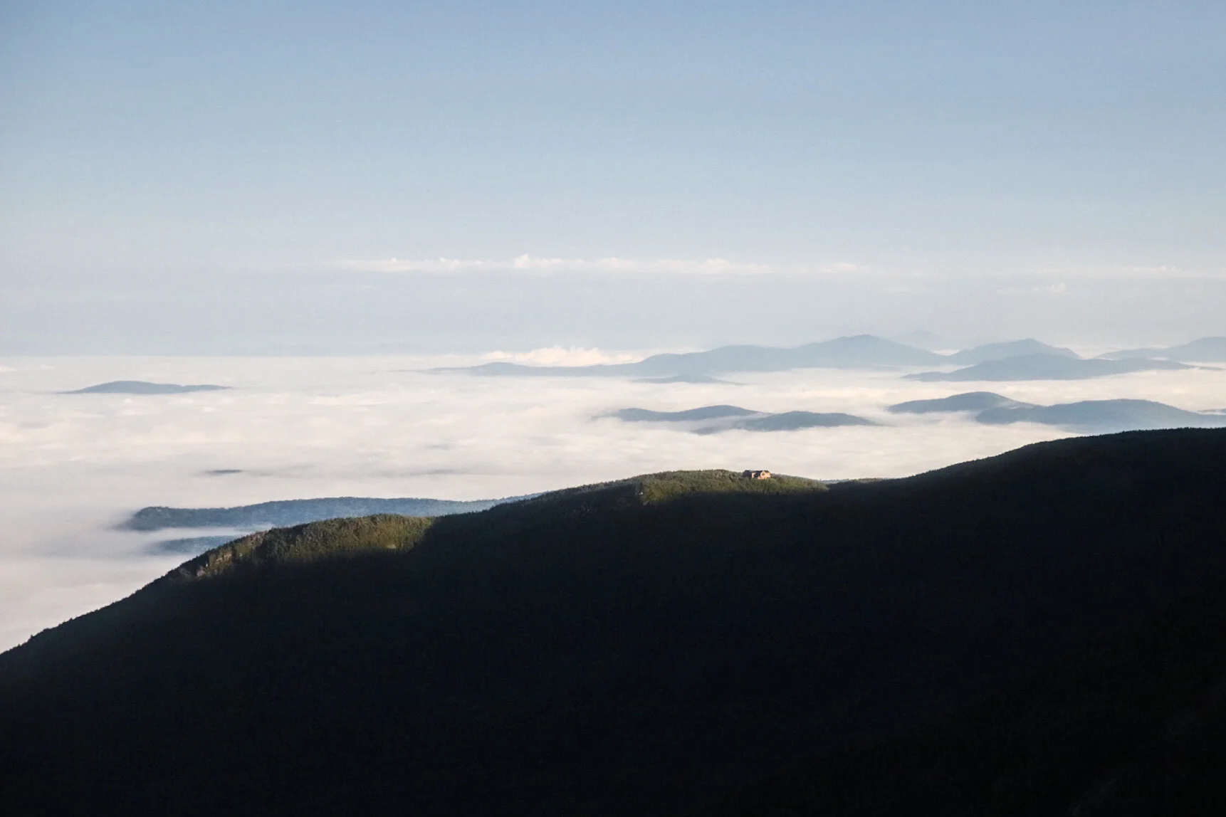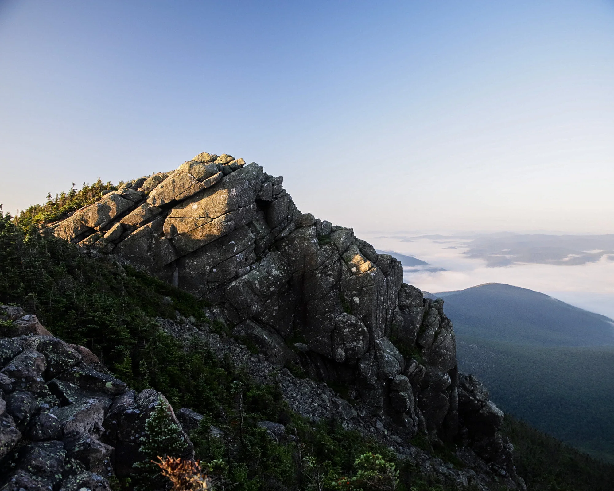 A classic image of the Mt. Liberty summit in early morning sunlight, with Lincoln, NH obscured by undercast in the valley below.