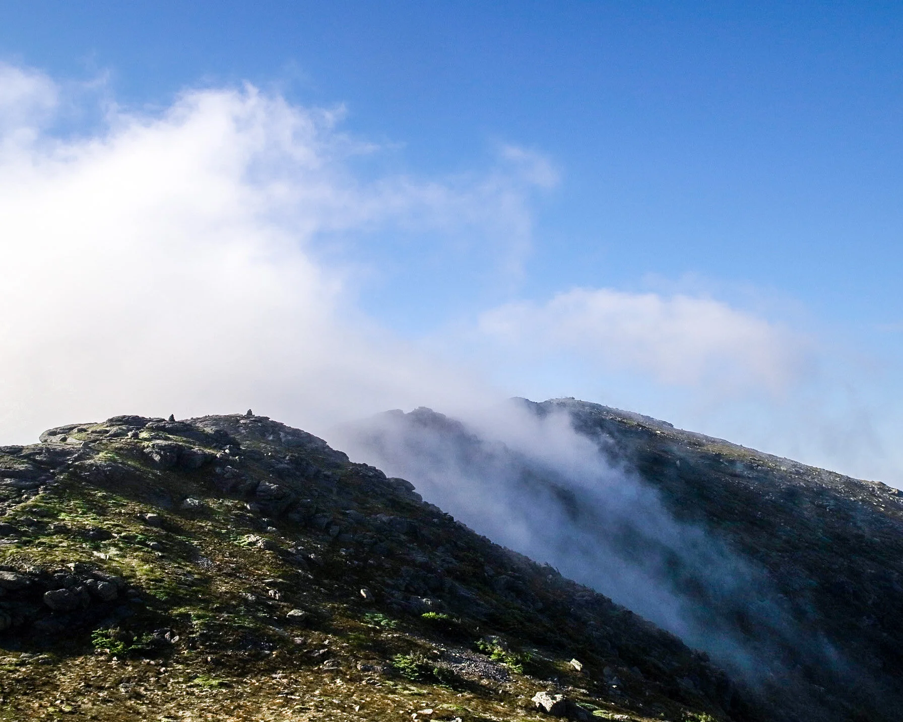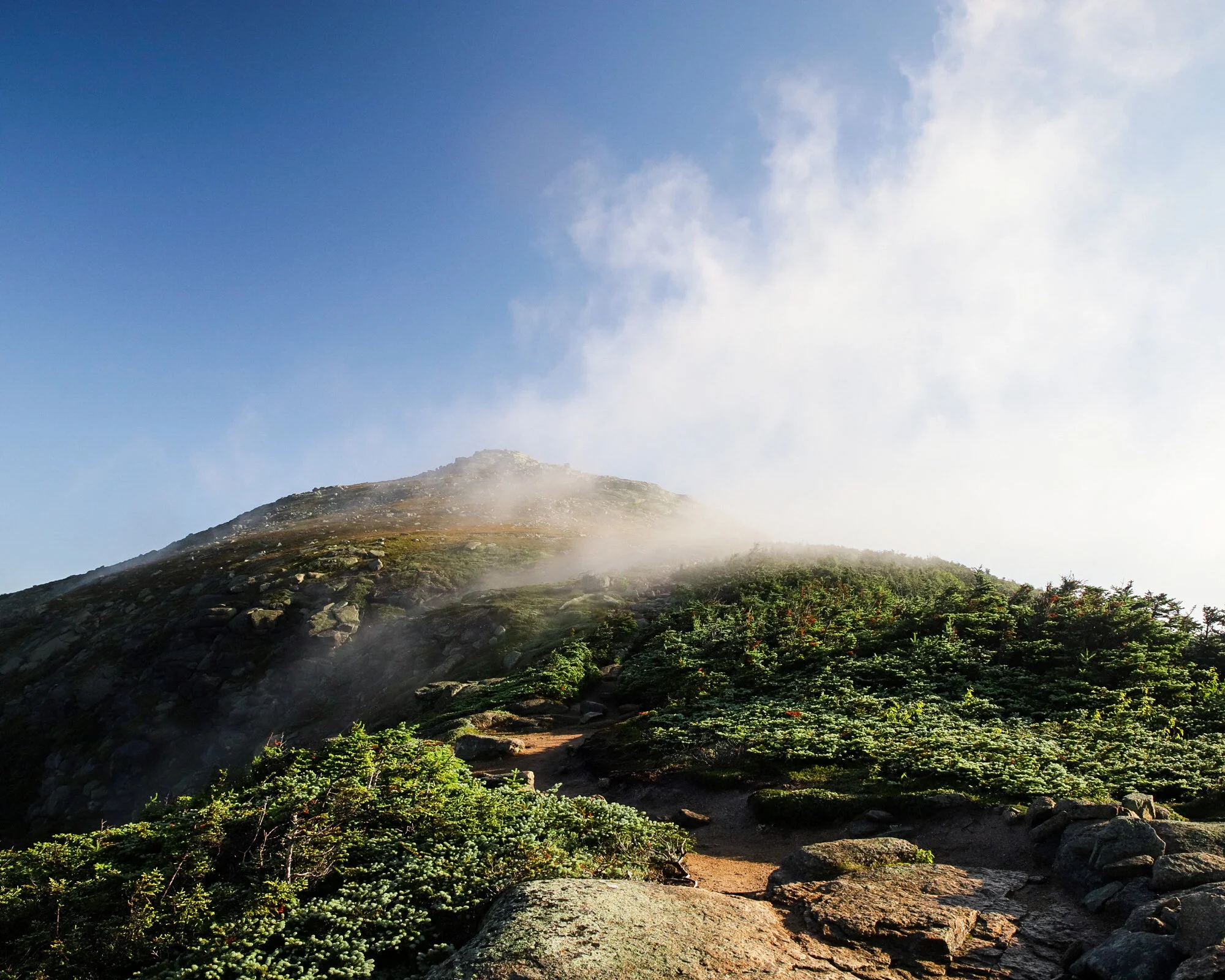 The very summit of Franconia Ridge, Mt. Lafayette, creating its own weather in the early morning sun.