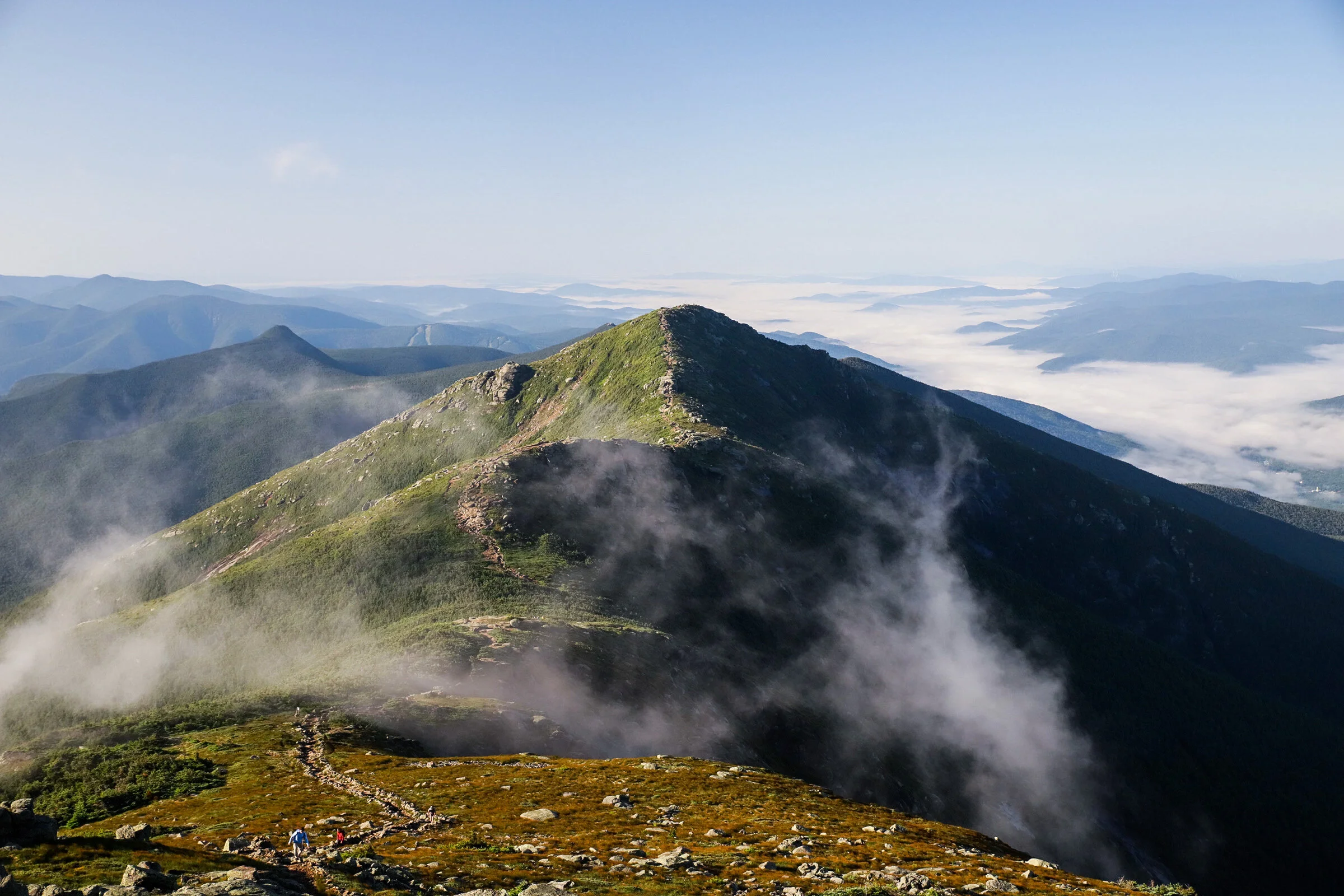 Climbing up Mt. Haystack brought me right to the Southern end of Franconia ridge, where I met the Falling Waters trail that clamors up the steep mountainside from the floor of Franconia Notch. If you were to take this trail, follow the ridge over Lincoln and Lafayette, and descend towards Greenleaf Hut and the Old Bridge Path, to finish where you started (or vice-a-versa), you would have hiked the Franconia Ridge Loop, which is one of the most popular hikes in New England. Beautiful summer weekends like this one can see hundreds of people traversing the ridge in a day. Even as I was reaching Mt. Haystack by 6:45AM, there were half a dozen groups of hikers already climbing the ridge ahead of me towards Mt. Lincoln.